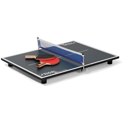 The Stiga Super Mini Table Top Table Tennis Table offers a fun way to test your skills and enjoy a game anytime, anywhere! This durable mini table includes rubber stoppers, to protect your table, desk, or floor. The Super Mini includes 2 mid-size paddles and ping pong balls to get you started!