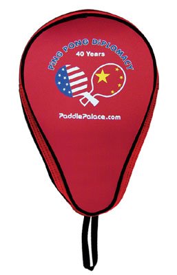 The Paddle Palace Ping Pong Diplomacy paddle case from Paddle Palace is paddle-shaped and has a ball pocket on the back side that holds 3 balls. This unique designer case celebrates the 40th Anniversary of Ping Pong Diplomacy . This red case features a large design of crossed Chinese and USA paddles, with the words, "Ping Pong Diplomacy, 40 Years."